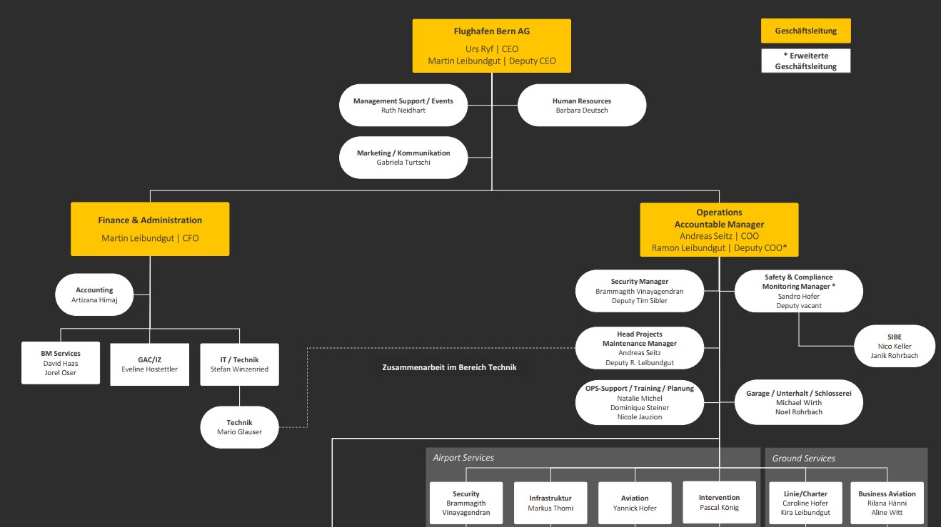 Die Geschäftsleitung der Flughafen Bern AG besteht aus Urs Ryf (CEO), Martin Leibundgut (CFO) sowie Andreas Seitz (COO).